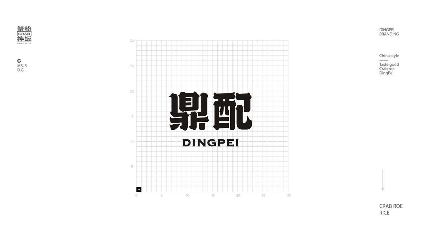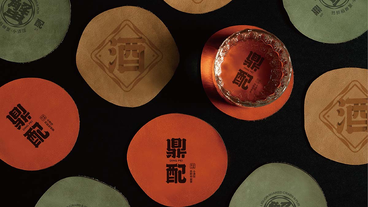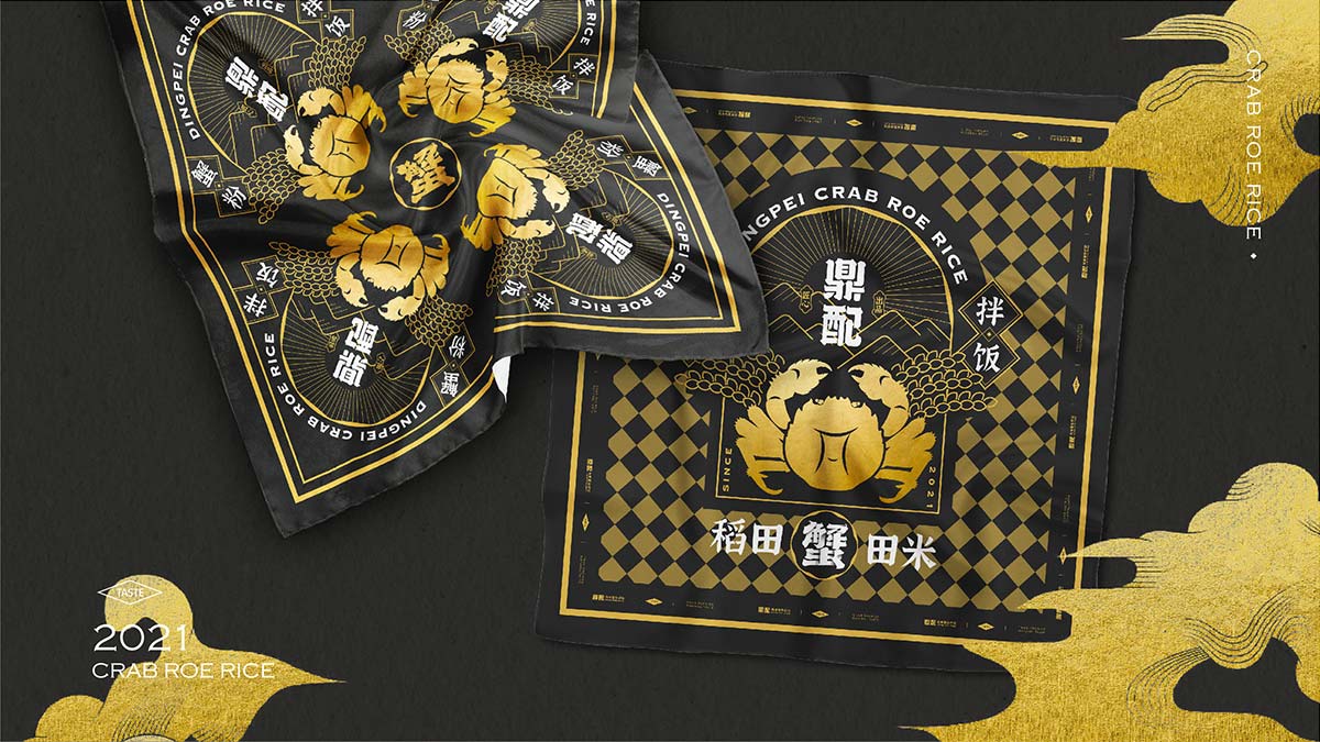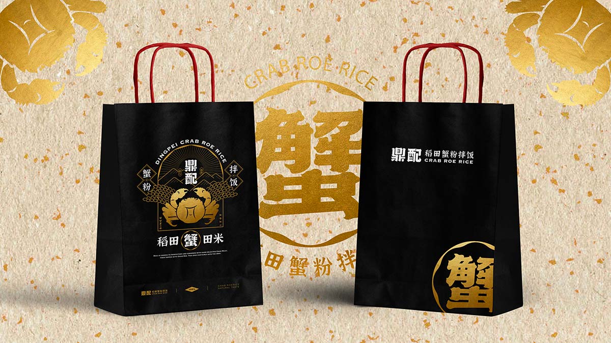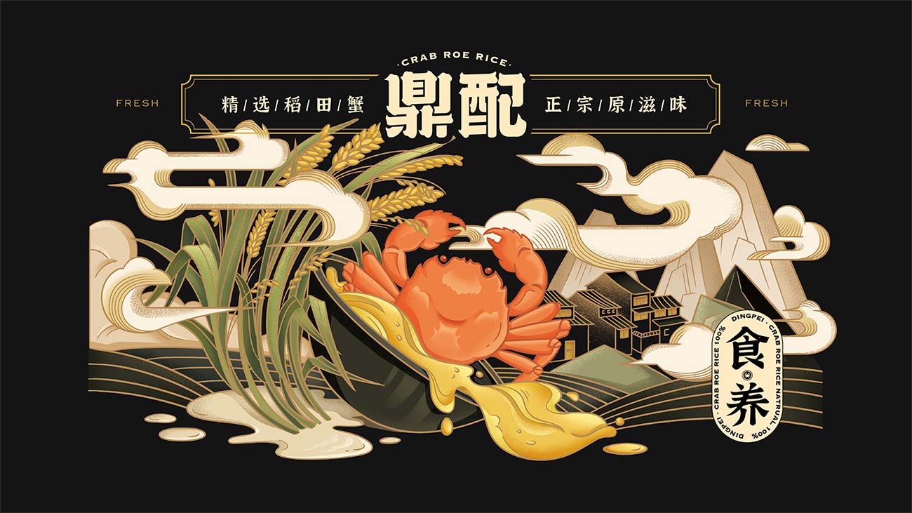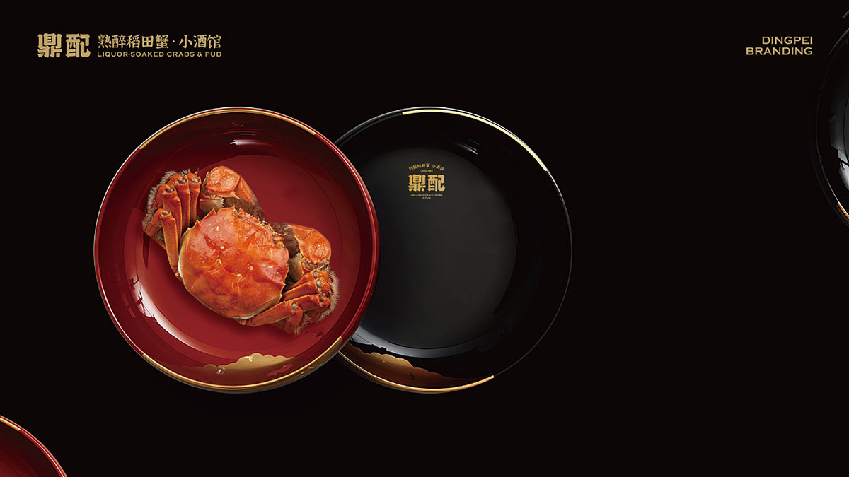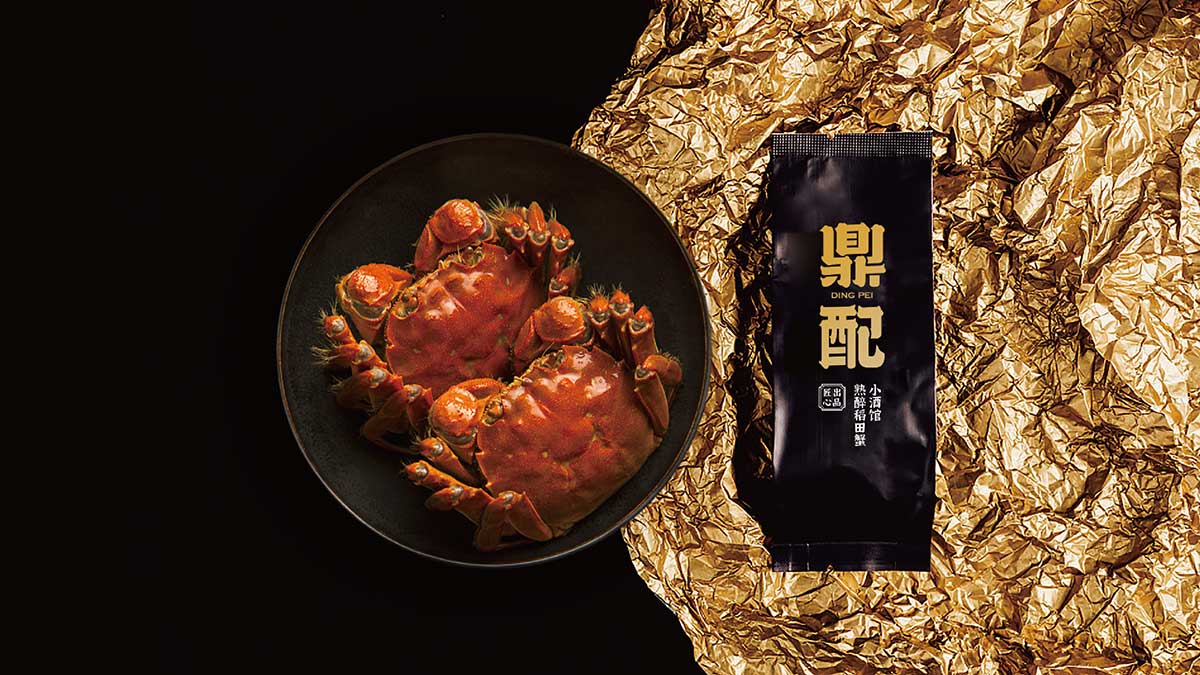鼎配主打蟹粉系列产品,搭配中式调酒。 品牌设计从“蟹粉”引申出以金粉作为品牌视觉元素,结合插画体现品牌的品质感。